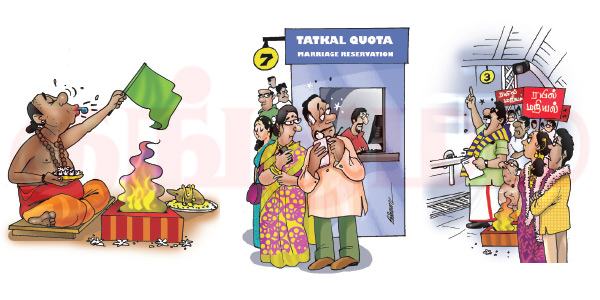 முன்பதிவு இல்லாத அனைத்து ஜோடிகளுக்கும் ஒரே பிளாட்பாரத்தில் கூட்டுக் கல்யாணமும், முன்பதிவு செய்த ஜோடிகளுக்கு தனித்தனி  பிளாட்பாரமும் திருமணத்துக்கு ஒதுக்கப்படும்! ‘நீட்’ முறைப்படி சென்னை ஜோடிகளுக்கு ராஜஸ்தானில் உள்ள ரயில் நிலையத்தில்தான் இடம்  ஒதுக்கப்படும். ரயில்வே துறை வழக்கப்படி முதியோருக்கு கட்டணச் சலுகை அளிக்கப்பட வேண்டும் என்பதால் முதிர்கன்னி / கண்ணன்கள் நீதி  கேட்டு போராடலாம். ஆறு மாதங்களுக்கு முன்பே இடம் பதிவு செய்யாதவர்களுக்கு அதிக கட்டணத்தில் ‘தட்கல்’ முறையில் இடம் ஒதுக்கப்படும்!