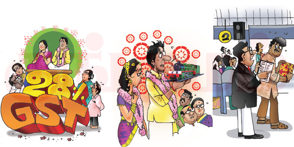 திருமணத்துக்கு ஒதுக்கப்பட்ட இடத்துக்கு செலுத்தப்படும் கட்டணத்துக்கு ஜிஎஸ்டி உண்டு. தவிர ‘திருமணம் என்பதும் ஒரு வகை சேவைதான். அந்த  பந்தத்தில் கணவன், மனைவிக்கு சேவை செய்கிறான்’ என்பதால் கூடவே சேவை வரியும் விதிக்கப்படும். இது அளவில்லா சேவை என்பதால்  அதிகபட்சமாக 28% வரி விதிக்கப்படும்!