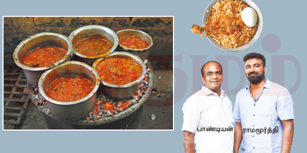 பேருக்கு கறிக்குழம்புனு இல்லாம அசைவத்துல கறி, மீன்  அதிகமாவே சேர்த்து செய்வோம். மதுரைக்கு தெற்குல அசைவத்துக்கு பேர் போன ஊர்கள்  நிறைய இருக்கு. அங்க இருந்து மாஸ்டரை வரவழைச்சோம்...’’ என்று சொல்லும் பாண்டியன், விறகு அடுப்பில்தான் தங்கள் சமையல் நடப்பதாகச்  சொல்கிறார். ‘‘வெங்காயம், தக்காளி மாசாலானு எல்லாத்தையும் சேர்த்து குறைவான  சூட்டுல சமைப்போம். ஒவ்வொரு பொருளும் எவ்வளவு நேரம்  வேகணும்னு பார்த்து சமைப்போம். அசைவம் சிறப்பா வர தரமான  மசாலா பொருளும் விறகடுப்பும் தேவை.