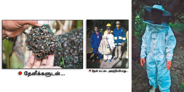 நான் ஆரம்பத்துல அடுக்குத் தேனீ, கொசுத் தேனீ கடிக்குப் பழக்கமானேன். இப்ப, மலைத் தேனீயும் பழக்கமாகிடுச்சு. இதுவரை 4 ஆயிரம் முறையாவது தேனீக்களிடம் கொட்டு வாங்கியிருப்பேன்...’’ என்கிறவர், மலைத் தேனீக்கள் தொடர்ந்து அழிக்கப்பட்டு வருவதாக வருந்துகிறார். ‘‘நம்ம பகுதிகள்ல மலைத் தேனீக்கள்தான் அதிகம் அழிக்கப்படுது. கட்டடங்கள்ல அதுகூடு கட்டுறதுதான் இதுக்குக் காரணம். இதைக் கலைக்க முதல்ல தீயணைப்பு நிலையத்துக்குத்தான் போன் செய்வாங்க. அதனால, நேரடியா தீயணைப்புத் துறையிடம் பேசினேன். அதன் தலைவர் சைலேந்திரபாபு சாரைப் பார்த்தேன்.