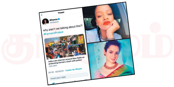 இரண்டு மாதங்களுக்கு மேலாக புதிய வேளாண் சட்டங்களை எதிர்த்து விவசாயிகள் போராடி வருகின்றனர். தில்லியில் நடந்து வரும் இப்போராட்டம் பெரிய அளவில் வெளி உலகின் கவனத்துக்கு உள்ளாக வில்லை. இந்நிலையில் விவசாயிகளுக்கு ஆதாரவாக ரியானா பதிவிட்ட ஒரேயொரு டுவிட், இந்தப் போராட்டத்தை உலகம் முழுவதும் முக்கிய பேசு பொருளாக மாற்றிவிட்டது.
