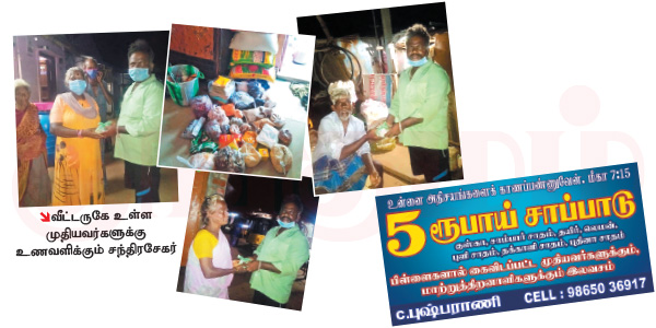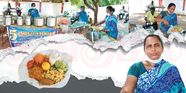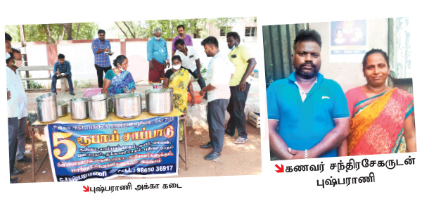 தருவார். இதனால, தொடர்ந்து சாப்பாட்டுக்கடையை நடத்திட்டு வர்றோம். முதல் அலை குறைஞ்சு கல்லூரிகள் திறந்தப்ப நல்ல லாபத்தில் நடந்தது. இப்ப ரெண்டாவது அலை வந்ததால மறுபடியும் கல்லூரி, அலுவலகங்கள், கடைகள் செயல்படல. ஆனாலும் விடக்கூடாதுனு தொடர்ந்து நடத்துறோம். ஏன்னா, எல்லோரும் 5 ரூபாய் சாப்பாடுனு சொல்ல ஆரம்பிச்சிட்டாங்க. தவிர, நிறைய பேருக்கு உணவும் பிடிச்சுப் போச்சு.