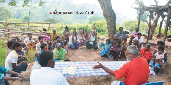 ‘‘நம்ம உழுகிற நிலம் நமக்கே சொந்தம்ன்னு சொல்லுது 2006 வன உரிமைச்சட்டம். அந்த நிலத்தை மணியகாரர், தாசில்தார் எல்லாரும் அளந்துட்டும் போயிருக்காங்க. அப்படி சொந்தமுள்ள நிலத்திற்கு நில உரிமைச் சான்று வேண்டி இந்த கிராம சபை தீர்மானம் போடுது. இதை நாம் மணியகாரர், ஆர்.ஐ, தாசில்தார் எல்லோருக்கும் அனுப்பப் போறோம்!’’ வசந்தராஜ் பேச, கூட்டமே கைதட்டுகிறது.