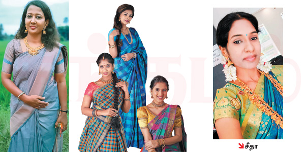 ‘‘மத்த எந்த டிசைன்கள்லயும் இந்த அளவுக்கு கலர்களை தெளிவா காட்ட முடியாது. அதேபோல கட்டம் போட்ட சேலைகள்ல பிளவுஸ்க்கு நாம மெனக்கெட வேண்டிய அவசியமே இல்லை. பெரும்பாலும் பிளைன் சிம்பிள் பிளவுஸ் மேட்ச் செய்தாலே புடவை கலர்ஃபுல்லா இருக்கிறதால கிராண்ட் லுக் கொடுத்திடும். அதேபோல வீட்டில் விசேஷம் அல்லது ஒரு கல்யாண வீடு அப்படின்னா பிளவுஸ்களில் ஆரி வேலைப்பாடுகள், எம்ப்ராய்டரி, புடவையில் ஜமிக்கி ஜரிகை... என எதுவுமே இல்லாம வெறுமனே காட்டன் மற்றும் பல கலர்களைக் கொண்டு கூட்டத்தில் பளிச்சென தெரிய முடியும்.