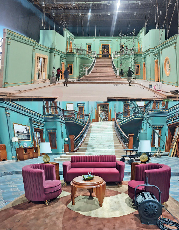 அதேபோல் செட்டில் உள்ள அனைத்து பழங்காலத்து விளக்குகளுமே மும்பையில் இருந்து கொண்டு வந்தோம். தரையில் பதிக்கப்பட்ட டைல்ஸ் கற்களை குஜராத்தில் பிரத்யேகமாக ஆர்டர் கொடுத்து வாங்கினோம்.படத்தில் ஸ்டூடியோ செட் பிரம்மாண்டமாக காண்பித்திருந்தார்கள்.