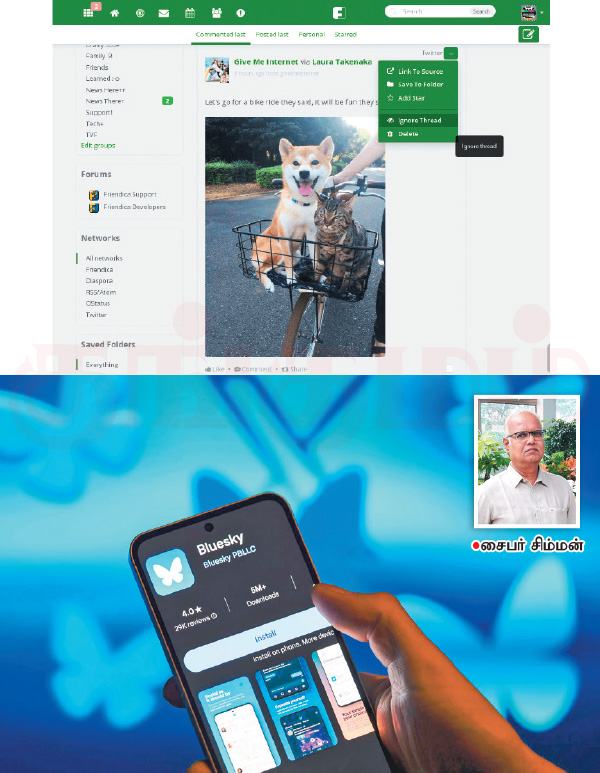 அப்ப நாம எதை செய்யணும், எதை செய்யக்கூடாது என்பதை ஒரு விதத்துல நம்மை அறியாமலேயே இந்த நிறுவனங்கள் வடிவமைக்கிற ஒரு சூழ்நிலை இன்னைக்கு இருக்கு. அதனால் பயனாளிகள் இந்த சமூக ஊடகங்கள் வேண்டாம்னு நினைக்கிறாங்க. வருங்காலத்தில் இதைப் பற்றிய விழிப்புணர்வு அதிகமாகும். அப்போ பயனாளிகள் இதிலிருந்து விடுபட நினைக்கலாம் அல்லது தங்களோட உரிமை வேணும்னு நினைக்கலாம். அப்ப இந்த மையமில்லா சேவைகளைத் தரும் சமூக ஊடகங்களின் தேவை அதிகமாகும்...’’ என்கிற சைபர் சிம்மன், தொடர்ந்தார். ‘‘இது ஒருபக்கம் என்றால் இன்னொரு பக்கம் மையப்படுத்தப்பட்ட சேவையிலேயே மற்ற சமூக வலைப்பின்னல் தளங்களையும் பலர் பயன்படுத்த ஆரம்பிச்சிருக்காங்க.