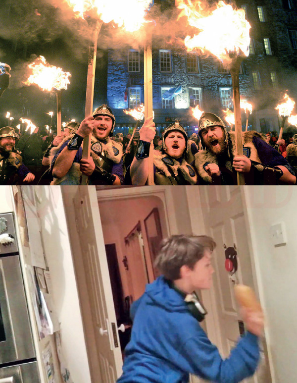 போர் வீரர்களைப் போல உடை அணிந்துகொண்டு கையில் தீப்பந்தத்தை ஏந்தி தெருவில் ஊர்வலம் வருவது இதில் முக்கியமான நிகழ்வு. புது வருடம் ஆரம்பிக்கும் நாட்களில் தெருக்களில் கும்பலாக நெருப்பைச் சுழற்றி வருவதால் தீய சக்திகள் விரட்டியடிக்கப்படும் என்று ஸ்காட்லாந்து மக்கள் நம்புகிறார்கள். பழைய பொருட்களை வீசவும்! (தென்னாப்பிரிக்கா)