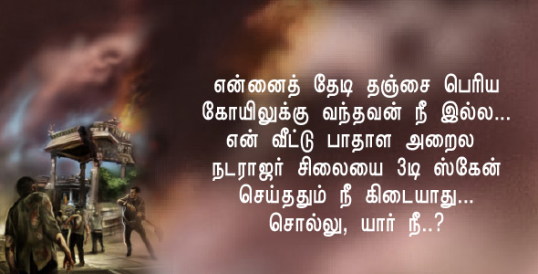 ‘‘பொய் சொல்லாத. என்னைத் தேடி தஞ்சை பெரிய கோயிலுக்கு வந்தவன் நீ இல்ல... என் வீட்டு பாதாள அறைல நடராஜர் சிலையை 3டி ஸ்கேன் செய்ததும் நீ கிடையாது... சொல்லு, யார் நீ..?’’