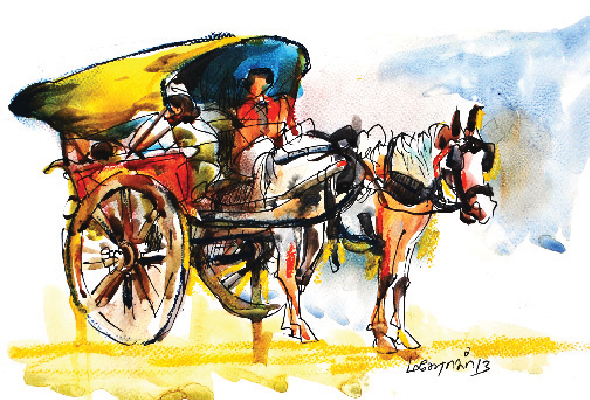 இன்னொரு காட்சியில், நான் ஒரு குதிரை வண்டியில் போய்க்கொண்டிருக்கிறேன். அந்தக் குதிரையின் பொன்னிறக் கழுத்து முடிகள் காற்றில் அலைந்துகொண்டே இருக்கின்றன. அதன் கண்களில் பச்சை நிறப் பட்டை ஒன்று கட்டப்பட்டிருக்கிறது. என் அம்மா என் தலையைத் தடவியபடியே இன்னொரு கையால் குதிரை வண்டியின் கம்பிகளைப் பிடித்துக் கொண்டிருக்கிறாள்.