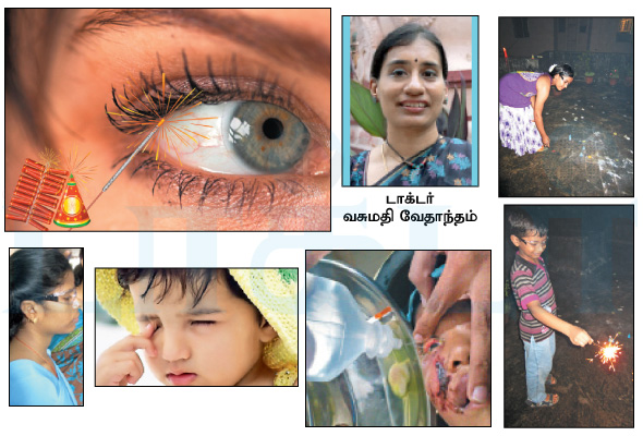‘ராதாத்ரி நேத்ராலயா டிரஸ்ட்’ மூலமாக ஒவ்வொரு வருட தீபாவளியின் போதும், குழந்தைகளுக்கும் பெற்றோருக்கும் பாதுகாப்பாக பட்டாசு வெடிப்பது குறித்த விழிப்புணர்வு முகாம்களை நடத்துகிறார் விழித்திரை சிறப்பு சிகிச்சை நிபுணர் வசுமதி வேதாந்தம்.‘‘பட்டாசு கொளுத்தும்போது 40 சதவிகித அளவு காயங்கள் கைகளிலும் 20 சதவிகிதக் காயங்கள் கண்களிலும் 20 சதவிகிதக் காயங்கள் தலை மற்றும் முகத்திலும் ஏற்படுகிறது. மீதமுள்ளவை உடலில் மற்ற பகுதிகளில் ஏற்படும் காயங்களாகும்.
