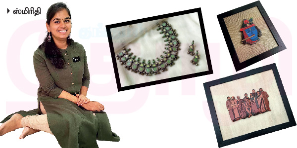 டெரகோட்டா நகைகள் மிகவும் இலகுவானது. நீண்ட நேரம் அணிந்திருந்தாலும் லேசான எடையுடன் அழகான தோற்றம் கொண்டவையாக இருக்கும்” எனும் ஸ்மிரிதி, கொரோனா கால ஊரடங்கின் போது டெரகோட்டா நகை தயாரிப்பில் ஈடுபட்டு, அந்த நேரத்தை பயனுள்ளதாக மாற்றிக் கொண்டார். “நான் ஒன்பதாம் வகுப்பு படிக்கும்போதிலிருந்தே எனக்கு டெரகோட்டா நகை தயாரிப்பில் ஆர்வம் ஏற்பட்டு, அதை கற்றுக்கொண்டேன். தொடர்ந்து நகை தயாரிப்பில் ஈடுபட்ட நான் படித்துக்கொண்டிருக்கும் போதே டெரகோட்டா நகைகளை தயாரித்து விற்பனை செய்யும் தொழிலை ஆன்லைன் மூலம் தொடங்கினேன். மக்களிடம் நல்ல வரவேற்பு கிடைத்தது. கொரோனா காலத்தில் டெரகோட்டா தயாரிப்பில் அதிக ஈடுபாட்டுடன் இருந்தேன். ஷிகா கிரியேஷன்ஸ் எனும் பிராண்டை தொடங்கி 9 வருடங்கள் ஆகிறது.
