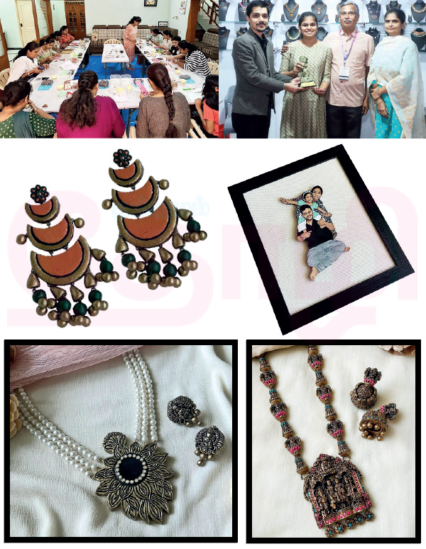 நாங்களும் சில ஆலோசனைகளையும் தருவோம். இவ்வாறு அவர்களுக்கு விருப்பமான நகைகளை முழுமையான தோற்றத்தில் தயாரித்து வழங்குகிறோம். நகைகள் மட்டுமின்றி டெரகோட்டாவில் வடிவமைக்கப்பட்ட 3D பிரின்ட் போட்டோ ஃபிரேம், கஸ்டமைஸ்டு கிஃப்ட் மற்றும் வீட்டு அலங்காரப் பொருட்கள் போன்றவற்றையும் தயாரிக்கிறோம்.