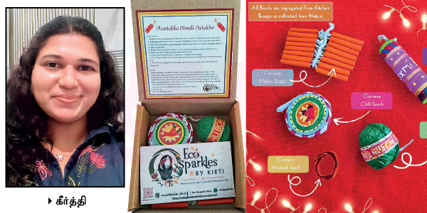 ஆனால், இதே மகிழ்ச்சியையும் ஆர்வத்தையும் நாம் வாழும் இந்த பூவுலகின் மீதும் காட்டினால் இன்னும் சிறப்பாக இருக்கும். தீபாவளி கொண்டாட்டத்தின் போது வெடிக்கப்படும் பட்டாசுகளால் நம் நாட்டில் அளவு கடந்த காற்று மாசுபாடு பதிவாகிறது என்பதை நாம் அறிவோம். அதைக் கருத்தில் கொண்டுதான் பசுமை பட்டாசுகள் அறிமுகமாயின. இதனால் மாசுபாடு ஏற்படுவது சற்று குறையும். அதுவும் வேண்டாம் என்று சுற்றுச்சூழல் மீது ஆர்வமுள்ளவர்கள் விதை பட்டாசுகளுக்கு மாறலாம். இதற்குள் வெடி மருந்துகள் இருக்காது. மாறாக விதைகள் வைக்கப்படுகின்றன. இந்த ஆண்டு தீபாவளி பண்டிகையை முன்னிட்டு பிரத்யேகமாக விதை பட்டாசுகளை தயாரித்து விற்பனை செய்து வருகிறார் கீர்த்தி.