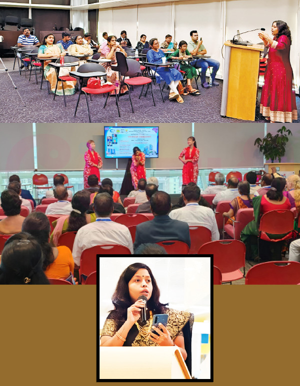 ஒரு நாள் அக்வா ஏரோபிக்ஸ் வகுப்பு முடிந்த பிறகு அதற்காக ஒலித்துக் கொண்டிருந்த பாடலை நிறுத்தும் போது தமிழ் பாட்டு ப்ளே ஆயிடுச்சு. தண்ணீரில் நின்று கொண்டு ஆக்வா ஏரோபிக்ஸ் செய்து கொண்டிருந்தவர்கள் அந்தப் பாட்டைக் கேட்டதும் அப்படியே நடனமாட ஆரம்பித்தார்கள். நானும் வெளியே இருந்து முழுப் பாட்டுக்கான நடன அசைவுகளை ஆடிக் காண்பித்தேன். அதைப் பார்த்து தங்களுக்கும் பரதம் சொல்லித்தர கேட்டார்கள். வாரத்தில் ஒருநாள் பரத வகுப்பு எடுக்கிறேன். அதில் இரண்டு சீனப் பெண்கள் தேர்வு செய்யப்பட்டு, அண்ணாமலை பல்கலைக்கழகமும், சிங்கப்பூரும் இணைந்து நடத்திய சர்வதேச கருத்தரங்கில் திருக்குறள் பாடலுக்கு நடனமாடினோம்’’ என்றவர், நடன ஆசிரியராக மட்டுமில்லாமல் நிகழ்ச்சி தொகுப்பது மற்றும் மேடைப் பேச்சு, கதை சொல்வது பற்றி விவரித்தார்.