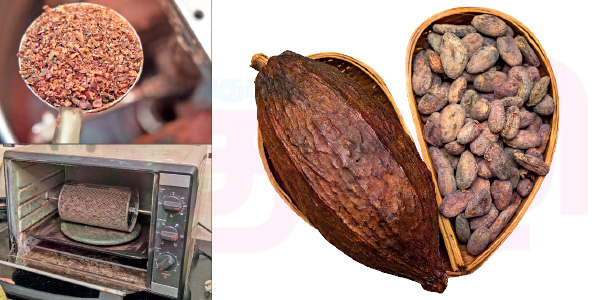 கோகோ மரத்தில் மஞ்சள் நிறத்தில் கோகோ பழங்கள் இருந்தால் அது நன்கு பழுத்த பழம். அந்தப் பழத்தை பறித்து அதற்குள் இருக்கும் சுளையினை நொதித்தல் முறையில் கொட்டைகளை எடுத்து காய வைத்தால் கிடைப்பதுதான் கோகோ பீன்ஸ். அதனை நாங்க மிஷினில் தோல்களை உரிச்சு, பவுடராக செய்து, நான்கு நாட்கள் அரைப்போம்.