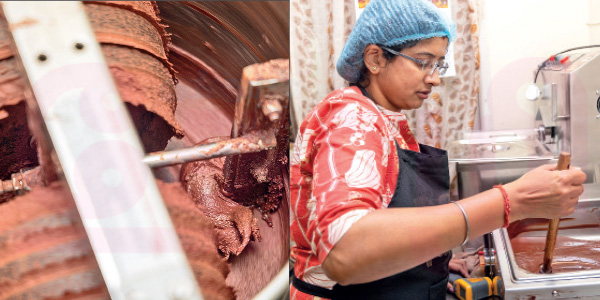 அந்த சமயத்தில் நாட்டுச் சர்க்கரை, பனங்கற்கண்டு, கோகோனட் சுகர், பிரௌவுன் சுகர் இதில் ஏதாவது ஒன்றை சேர்ப்போம். பிறகு சாக்லேட் மோல்களில் சேர்த்து பிரீஸ் செய்தால் டார்க் சாக்லேட் ரெடி. பாதாம், முந்திரி, வால்நட் என மூன்று ஃபிளேவர்களில் கொடுக்கிறோம்.