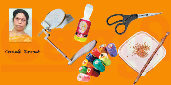 தேவையான பொருட்கள் விரும்பிய வண்ணத்தில் சில்க் த்ரெட், ஷரி த்ரெட், பேப்ரிக் கம், விரும்பிய வடிவில் கண்ணாடி தகடுகள், கோல்டன் பீட்ஸ், திலக் குந்தன், கத்தரிக்கோல், ஆரி நீடில், இரும்பு ஸ்டாண்டுடன் வுட்டன் பிரேம், டிசைன் பண்ண தேவையான துணி.