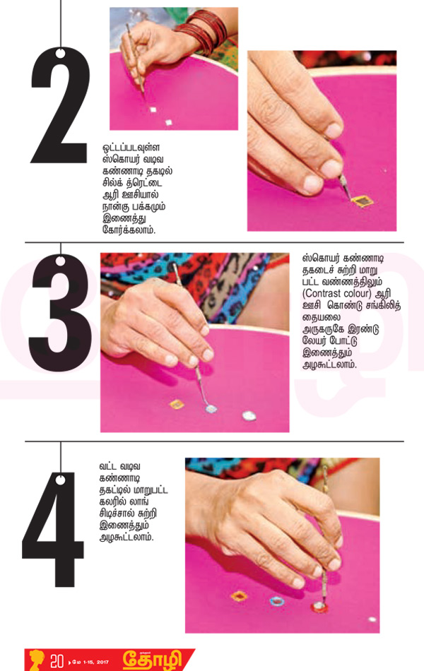 மிகவும் சிம்பிளாக ஒரே வண்ணத்தில் எடுக்கப்பட்ட சுடிதார் டாப்ஸ் அல்லது சேலையினை நாம் விரும்பும் வடிவங்களில் உள்ள சிறு சிறு கண்ணாடி தகடுகளைக் (Glass pieces) கொண்டு துணியில் ஒட்டி அதைச்சுற்றி வேண்டிய வண்ணத்தில் உள்ள நூலை ஆரி நீடிலைக் கொண்டு விரும்பிய பின்னலில் இணைத்து மெருகூட்டினால் அது பார்ப்பதற்கே அழகான தோற்றத்தை அள்ளித் தந்துவிடும். அதற்கான செய்முறை விளக்கத்தை நமக்காக செய்து காட்டுகிறார் மோகன் ஆடை வடிவமைப்பு நிறுவனத்தின் இயக்குநர் செல்வி மோகன் தலைமையில் அதன் பயிற்சியாளர் அனுராதா.