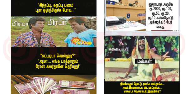 கறுப்புப் பணத்தை அழிப்பது எப்படி? மோடி: முதலில் நட்ராஜ் அழி ரப்பர் வாங்கவும். முதலில் ‘க’வின் மீது அழுத்தித் தேய்க்கவும். அப்புறம் ‘று’வின் மீது அழுத்தித் தேய்க்கவும். அப்புறம் ‘ப்’பின் மீது அழுத்தி... இப்படியாக 50 நாட்களில் கறுப்புப் பணம் ஒழிக்கப்படும். ஒழியவில்லை என்றால் கேமல் அழிரப்பர் வாங்கவும்! - அல்டாப்பு வினோத்