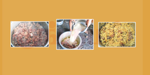 அரிசியைக் கழுவி 15 நிமிடங்கள் ஊற வைக்கவும். பொடிக்க கொடுத்துள்ளவைகளை அடி கனமான வெறும் கடாயில் வறுத்து பொடிக்கவும். அடி அகலமான பாத்திரத்தில் எண்ணெய், நெய்யை அதிகமாக சேர்க்கவும். இந்த பிரியாணியின் சிறப்பே எண்ணெய் வாசம்தான். கூடவே தாளிக்க கொடுத்துள்ளவைகளைச் சேர்த்து, குறைந்த அளவு இஞ்சி பூண்டு சேர்த்து வதக்கி, வெங்காயம், தக்காளி, உப்பு சேர்த்து வதக்கவும்.பிறகு மிளகாய்த்தூள் சேர்த்து நன்கு கிளறி வெள்ளாட்டுக் கறியைச்சேர்த்து 5 நிமிடங்கள் வதக்கவும். பின் வறுத்து பொடித்த பொடியைச் சேர்த்து நன்கு கிளறவும். தேங்காயுடன் 200 கிராம் நீர் சேர்த்து அரைக்கவும். அரைக்கும்போது சிறிது இஞ்சி, பூண்டு சேர்த்து பால் எடுத்து அதனுடன் கலந்து கொதிக்க விடவும். நீர் கொதித்ததும் புதினா, கொத்தமல்லி, சீரகசம்பா அரிசியைச் சேர்க்கவும். இறுதியாக எலுமிச்சை சாறு. தண்ணீர் சுண்டி வரும்போது தோசைக்கல்லை வைத்து அதன்மீது பாத்திரத்தை வைத்து மூடி 30 நிமிடங்கள் தம்மில் போடவும். தம்மில் கிடைக்கும் அனலில்தான் பிரியாணி வேகவேண்டும்.