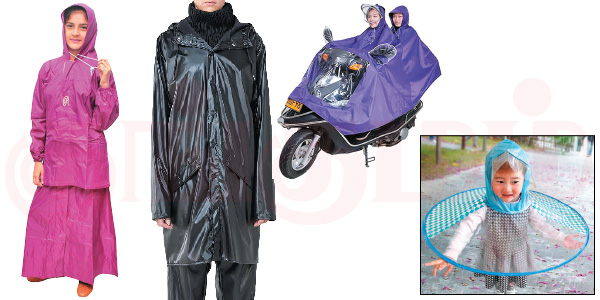 பளிச்செனத் தெரியும் கலர்களில் வரும் பிளாஸ்டிக் ரெயின் கோட், சிறுவர்கள் முதல் பெரியவர்கள் வரை நீண்ட அங்கி போல் அணியும் உடை. பெரும்பாலும் மஞ்சள் நிறத்தில்தான் வரும்.