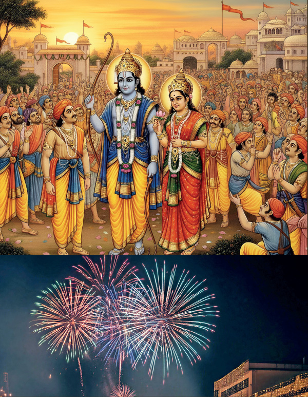 வனவாசத்தை நிறைவு செய்த ராமன், சீதையோடும் லட்சுமணனோடும் அயோத்தியில் நுழைந்த தினம் தீபாவளியாக கொண்டாடப் படுகிறது. அன்றைய தினம் அயோத்தி மக்கள், ராவணனை வென்று வெற்றியோடு திரும்பிய ராமனை ஆரவாரத்துடன் கொண்டாடி வரவேற்றனர். மேலும் அன்றைய தினம், ராவணனின் பொம்மைகளை எரித்து ராமனின் வெற்றியைப் பறைசாற்றினார்களாம்.  அந்த வழியில்தான் நாமும் இன்றும், ராமன் தனது பாணங்களால் ராவணனின் அரக்கர் கூட்டத்தைத் தூள் தூளாக்கியதற்கு அடையாளமாக தீபாவளியன்று பட்டாசுகள் வெடித்து, மத்தாப்புகள் கொளுத்துகிறோம். பட்டாசு சிதறுவது போல் ராவணனின் தலைகள் யாவும் ராம பாணங்களால் தாக்கப்பட்டு சிதறின. ஒளிமிக்க விதவிதமான வண்ண மத்தாப்புகள் ராமன் யுத்தத்தில் விடுத்த விதவிதமான அஸ்திரங்களைக் குறிக்கின்றன.