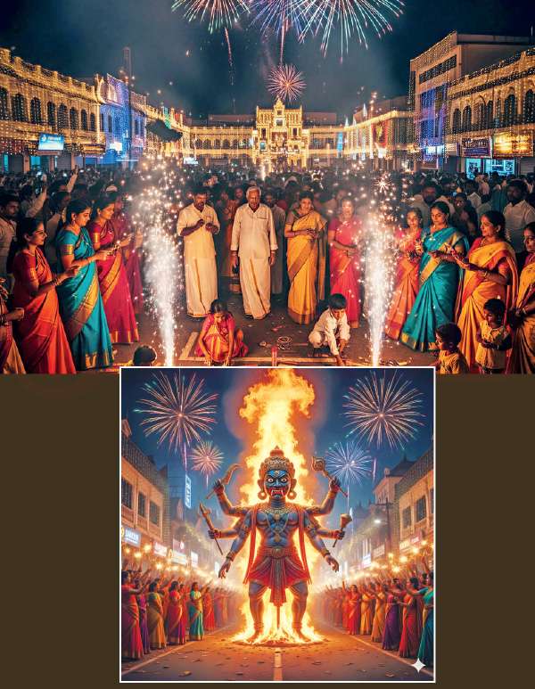 அந்த வகையில், கொடுமைகள் செய்த அரக்கன் ஒழிந்த நாளை, அதர்மத்தை எதிர்த்து தர்மம் போரிட்டு வென்ற நாளை நாம் தீபாவளியாகக் கொண்டாடுகிறோம்.