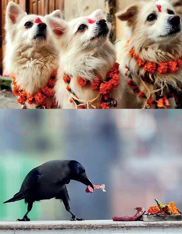 முதல் நாள் காகங்களைக் கொண்டாடி, உணவு வைக்கின்றனர். இரண்டாம் நாளில் நாய்களை வணங்கி, உணவு கொடுக்கின்றனர். மூன்றாம் நாள் பசுக்களை வழிபட்டு, லட்சுமி பூஜையும் நடக்கிறது. நான்காம் நாளில் விவசாயத்துக்குப் பெரும் பங்களிப்பைச் செய்ததற்காக எருதுகளை வழிபாடு செய்கின்றனர். ஐந்தாம் நாளில் சகோதரத்துவத்தை வெளிப்படுத்தும் விதமாக கொண்டாட்டங்கள் அரங்கேறுகின்றன.