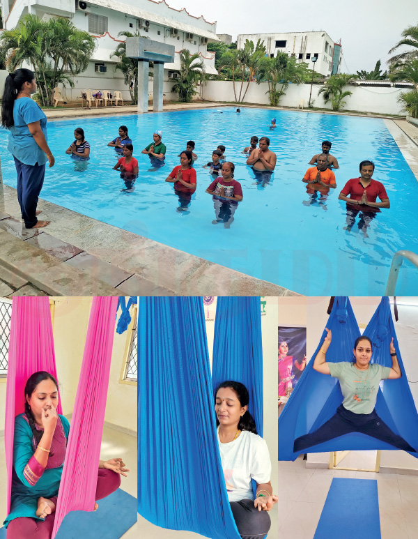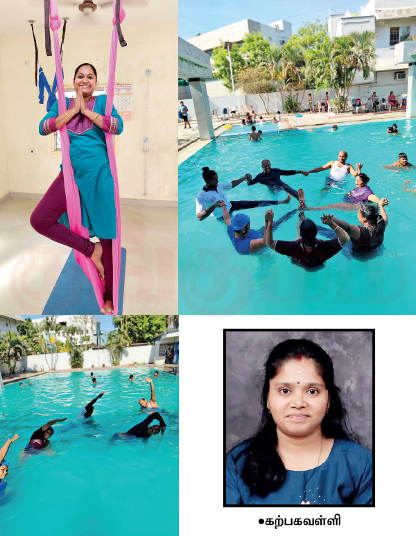 அப்படித்தான் அக்வா யோகா’ பற்றி தெரிய வந்தது. நீச்சல் குளத்தில் செய்யக் கூடிய இந்த யோகாசனப் பயிற்சியில் என்ன வித்தியாசம் உள்ளது என்று தெரிந்துகொள்ள அதற்கான பயிற்சியில் ஈடுபட்டேன்.சில அடுக்குமாடி குடியிருப்பு களில் நீச்சல் குளம் இருக்கும். அங்கு அனுமதி பெற்று பயிற்சி அளித்தோம். ஹோட்டலில் உள்ள நீச்சல் குளத்திலும் பயிற்சி கொடுத்தோம். இரண்டு மணி நேரப் பயிற்சியினை நான்கு வருடங்களாக குறிப்பாக வெயில் காலத்தில் மட்டுமே அளித்து வருகிறோம்.