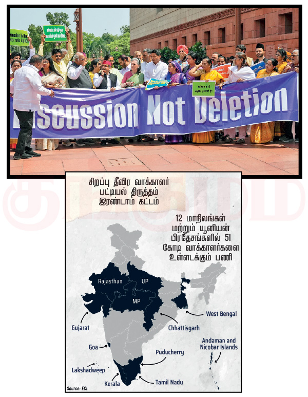 SIR எனும் சிறப்பு தீவிர வாக்காளர் பட்டியல் திருத்தத்தை (Special Intensive Revision) தமிழ்நாடு உட்பட 12 மாநிலங்களில் இரண்டாம் கட்டமாக நடத்த இந்தியத் தேர்தல் ஆணையம் களமிறங்கி உள்ளது. இந்நிலையில் இந்தச் சிறப்பு தீவிர திருத்தம் அவசரமாக செய்யப்படுவதாக திமுக உள்ளிட்ட பல்வேறு கட்சிகளும் எதிர்ப்பு தெரிவித்துள்ளன. கடந்த வாரம் தமிழக முதல்வர் மு.க.ஸ்டாலின் தலைமையில் நடந்த அனைத்துக் கட்சிக் கூட்டத்தில் சிறப்பு தீவிர திருத்த பணிகளை நிறுத்தி வைக்கக் கோரியும், இதனை இந்தியத் தேர்தல் ஆணையம் ஏற்காவிட்டால் உச்சநீதிமன்றத்தில் வழக்கு தாக்கல் செய்யவும் தீர்மானம் நிறைவேற்றப்பட்டுள்ளது.  அப்போது பேசிய முதல்வர், ‘‘நேர்மையான தேர்தலுக்கு உண்மையான வாக்காளர் பட்டியல் அவசியம் என்பதை யாரும் மறுக்கவில்லை. ஆனால், அதற்கு உரிய கால அவகாசத்தைக் கொடுக்கவேண்டும். பதற்றமில்லாத சூழலில் அதைச் செய்ய வேண்டும். தேர்தலுக்கு சில மாதங்களுக்கு முன்பாக முழுமையான திருத்தப் பணிகள் செய்ய நினைப்பது உண்மையான வாக்காளர்களை நீக்குவதற்கான தந்திரமாகும்.