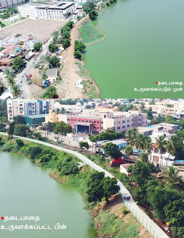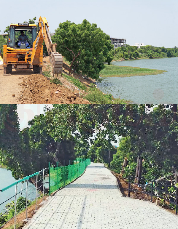 குறிப்பா பக்கவாட்டிலும், மேற்பகுதியிலும் மண்ணை கச்சிதமாக அழுத்தி பலமாக்கியிருக்கோம். இதனால், பெருமழை பெய்தாலும் தண்ணீர் வெளியே லீக் ஆகாது. அப்புறம் நிறைய மரங்கள் நடவு செய்தோம். தொடர்ந்து ஏரியின் உள்ளே இருந்த ஆகாயத்தாமரைகளையும், ஹைட்ரில்லா என்கிற ஆக்கிரமிப்பு தாவரத்தையும் அகற்றினோம். இதன்பிறகு நடைபாதை அமைத்து அழகு படுத்தினோம். இனி இதில் அங்குள்ள குடியிருப்புவாசிகள் நடைபயிற்சி மேற்கொள்ளலாம்.
