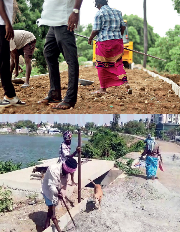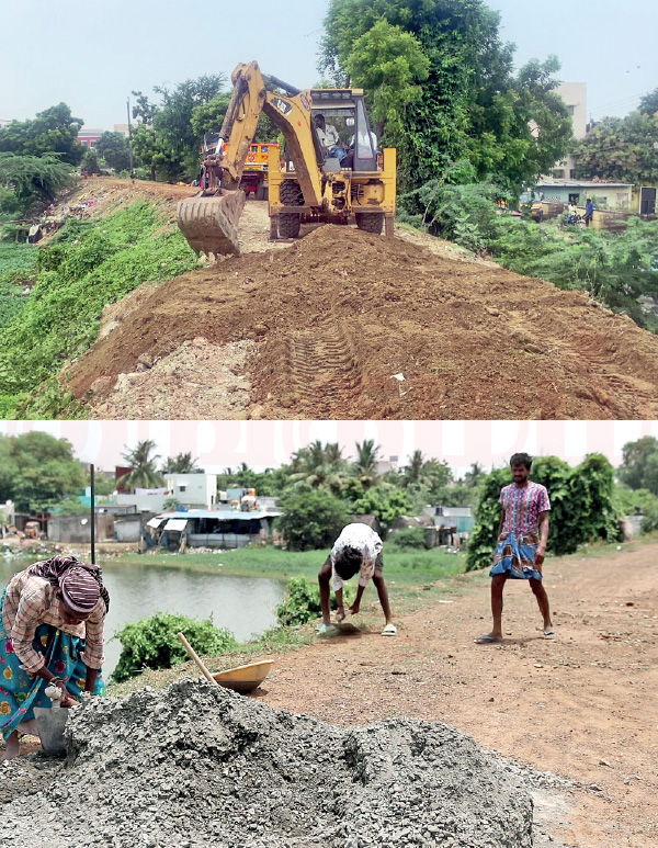 அப்படியாக முதல்கட்டமாக ஏரியை மறுசீரமைப்பு செய்து மழை வெள்ளம் குடியிருப்புக்குள் புகாமல் இருக்க பணிகளை மேற்கொண்டோம். இதற்காக சுமார் 150 டூ 160 லோடு மண் பயன்படுத்தினோம். இதன்வழியே நான்கு முதல் ஐந்து அடி வரை கரையின் வரப்பு உயரத்தை கூட்டினாம். அப்புறம் வரப்பின் அகலத்தை அதிகப்படுத்தினோம். பிறகு மண் அரிப்பைத் தடுக்கும் வகையில் மண்ணை இறுக்கமாக அழுத்தி சீரமைச்சோம்.