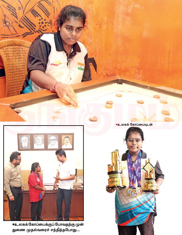 அப்ப, வீட்டுக்கு அருகே ஒரு தனியார் கிளப்ல பயிற்சி செய்தேன். அங்க என்னால் பணம் கட்டமுடியல. பிறகு சுங்கச்சாவடியில் உள்ள ஒரு ஸ்டீல் பட்டறையில் வேலைக்குப் போயிட்டு இருந்தேன். இந்நேரம்தான் கேரம்மேன் கோச்சிங் அகடமி நிறுவனர் நித்தியராஜன் சாரை சந்திச்சேன்.அவர்தான் ‘மறுபடியும் நீ விளையாடி ஜெயிக்கணும்மா’னு ஊக்கப்படுத்தி என்னை வரவழைச்சார்.