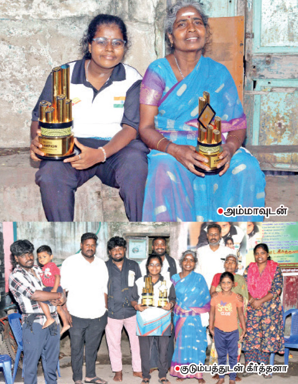 இப்போது அதே பகுதியைச் சேர்ந்த கீர்த்தனா வென்று வந்துள்ளார். இதனால், புது வண்ணாரப்பேட்டை ஏரியாவே வண்ணமயமாய்க் காட்சியளிக்கிறது. அங்கே சின்னஞ்சிறு வீட்டில் அம்மா இந்திராணி, அண்ணன் பிரசாந்த், ஒட்டிப்பிறந்த தம்பி கிருஷ்ணன் ஆகியோருடன் வசித்து வருகிறார் கீர்த்தனா.  ஒற்றை படுக்கை அறை கொண்ட அந்த வீட்டில் கீர்த்தனா வென்று வந்த கோப்பைகளையும், பதக்கங்களையும் அடுக்கக்கூட இடமில்லை. இதனால் பல கோப்பைகளை அண்டா ஒன்றில் போட்டு வைத்துள்ளார் அவரின் அம்மா.
