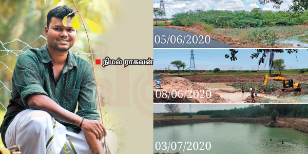 ‘‘சொந்த ஊர் தஞ்சாவூர் மாவட்டத்திலுள்ள பேராவூரணி. அப்பா ராகவன் விவசாயி. எங்கக் குடும்பமே பெரிய விவசாயக் குடும்பம். நான் பி.இ முடிச்சதும் வேலைக்காகத் துபாய் போயிட்டேன். லீவுக்கு ஊருக்கு வரும்போது கஜா புயல். அப்ப ஒவ்வொரு வீட்டிலும் துக்கம் நிறைஞ்சு இருந்தது. யார்கிட்டயும் நம்பிக்கையில்ல. எங்க ஊர்ல தென்னை மரங்கள் அதிகம். ஒரு ஏக்கர் தென்னை மரத்துல வர்ற வருமானமும், ஐந்து ஏக்கர் நெல்லுல வர்ற வருமானமும் ஒண்ணு. இதனால, எங்க மக்கள் எல்லோரும் தென்னை விவசாயம் செய்தாங்க.  கஜா புயல்ல 80 சதவீத மரங்கள் விழுந்திடுச்சு. இந்நேரம் வாழ்வாதாரமே இல்லாம தவிச்சாங்க. இனி ஒரு தென்னங்கன்றை வளர்த்து விளைச்சல் எடுக்கணும்னா குறைஞ்சது ஐந்தாண்டுகளாகும். அதுவரை என்ன பண்றது? அப்பதான் இவங்கள அரிசி, கரும்பு எல்லாம் பயிரிட வைப்போம்னு நினைச்சேன். ஆனா, தண்ணீர் பெரிய பிரச்னையா இருந்துச்சு. அங்கிருந்து ஆரம்பிச்சது நீர்நிலைகளை மீட்கும் பணி...’’ என்கிற நிமல் தொடர்ந்தார்.