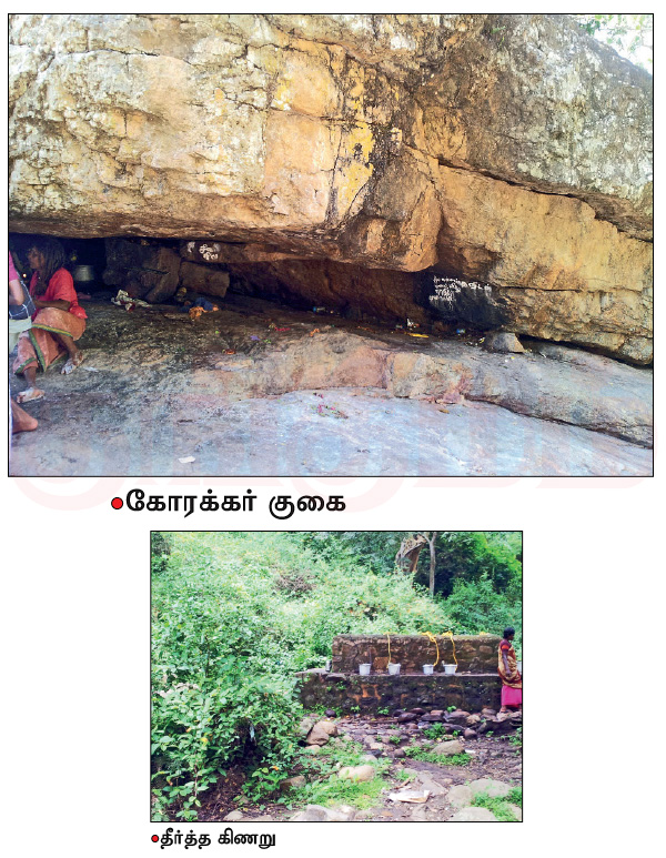 வழியில் ராஜயோக காளி, பேச்சியம்மன், கருப்பண்ணசாமி கோயில்கள் உள்ளன.அத்ரி மகரிஷி பூஜித்த லிங்கத்தை தரிசித்து மேலே செல்ல வழியில் கோரக்க சித்தர் தவம் செய்த குகையும், பதஞ்சலி முனிவரின் சீடர்கள் பூஜித்த லிங்கமும் காணப்படுகின்றன.